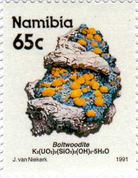 Boltwoodite HK(UO2)(SiO4)·1.5(H2O) |